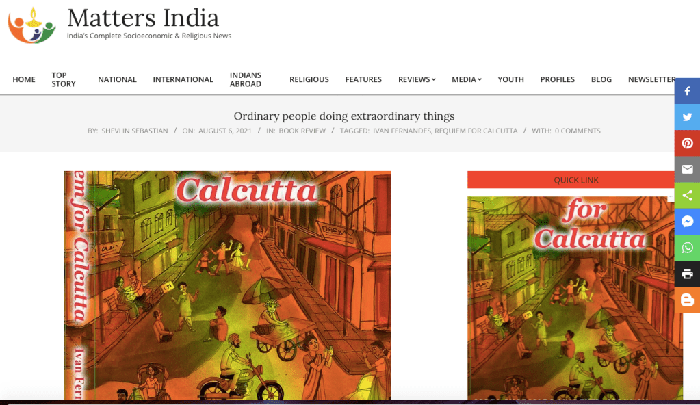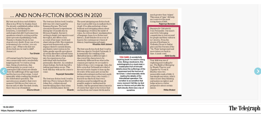 Press Coverage on Requiem for Calcutta Times of India, Pune. October 17, 2021. Matters India, New Delhi. August 6, 2021. The Telegraph, Calcutta. February 16, 2021. An interview with … Requiem for Calcutta Get the book